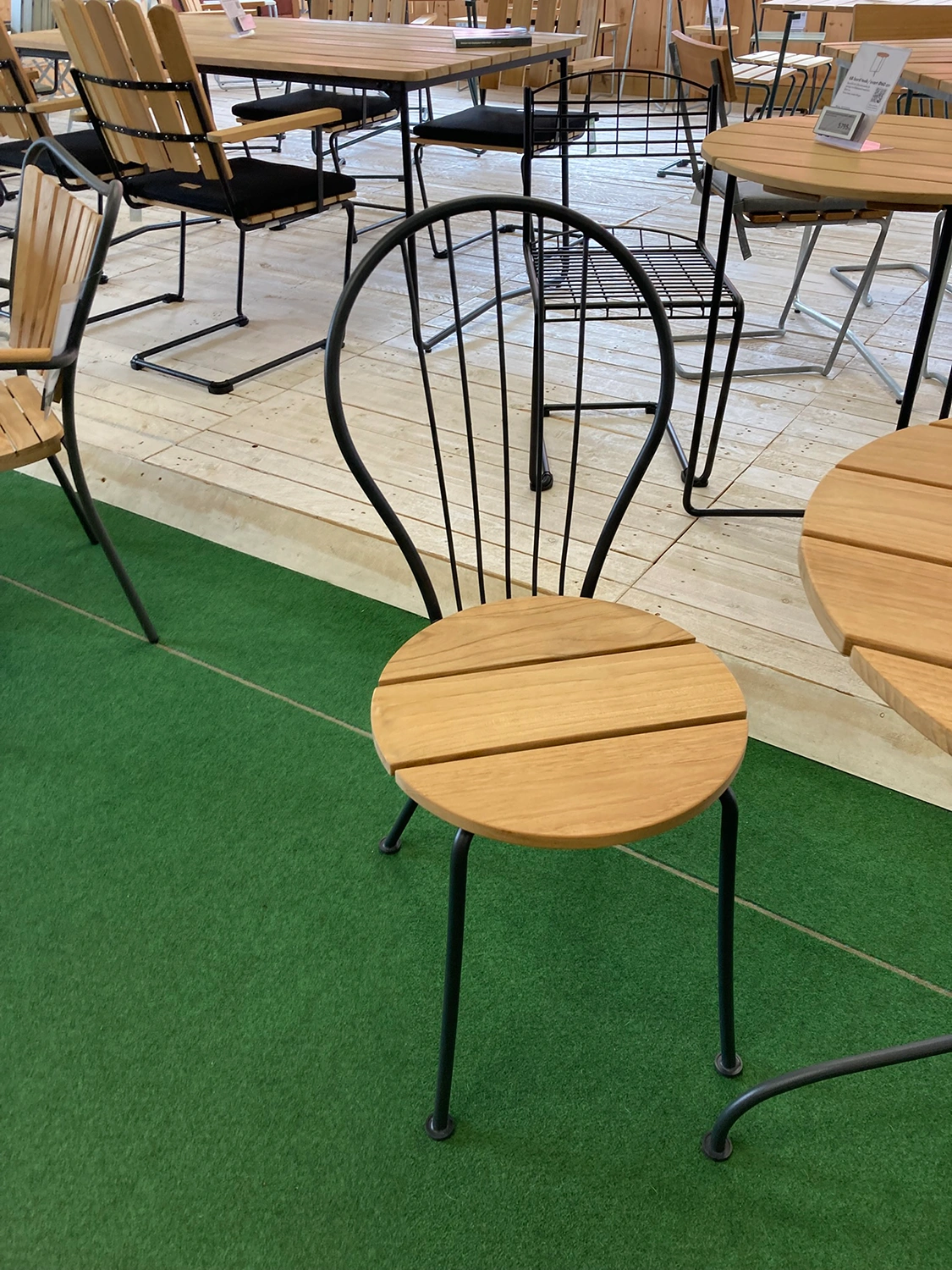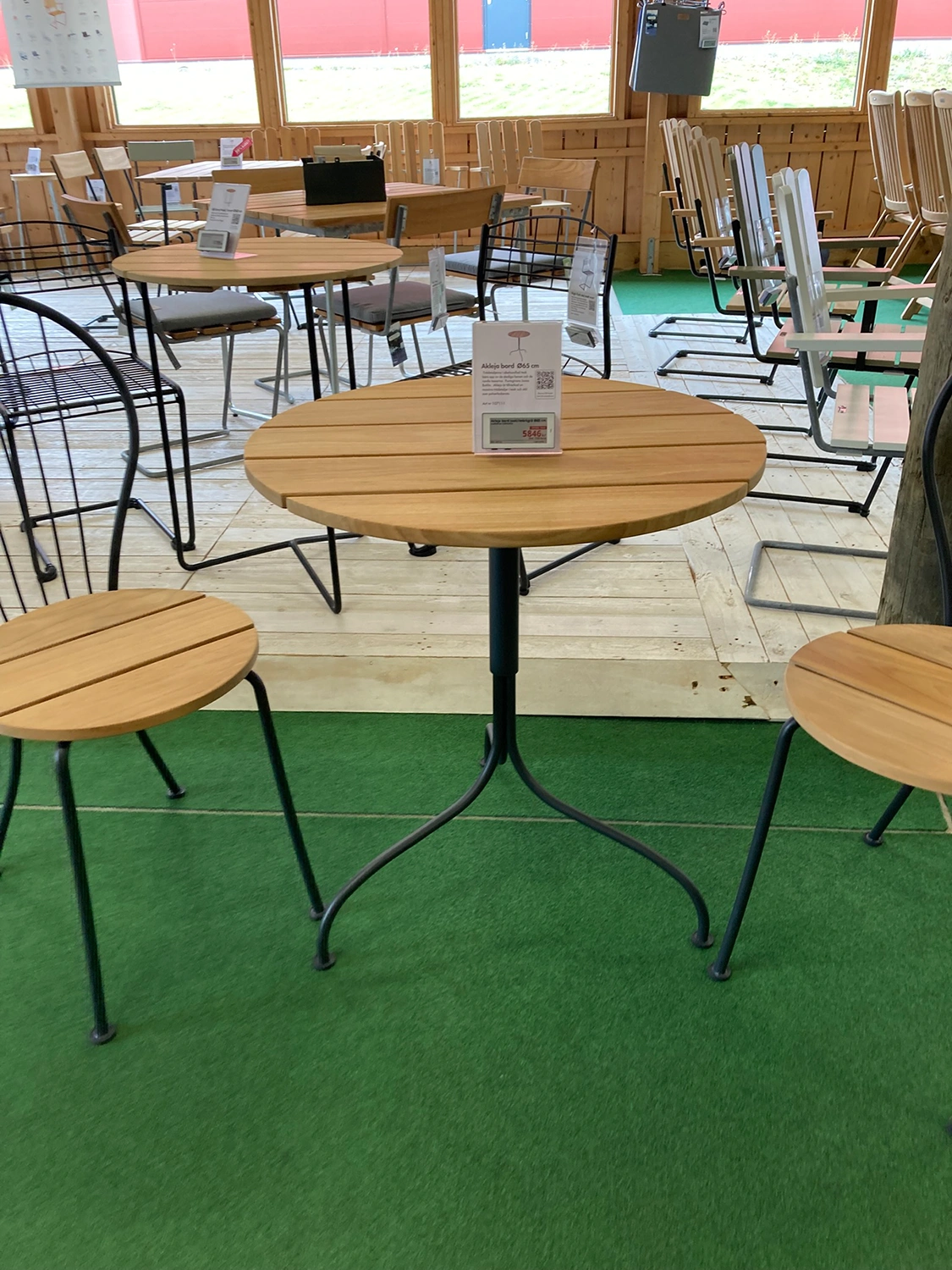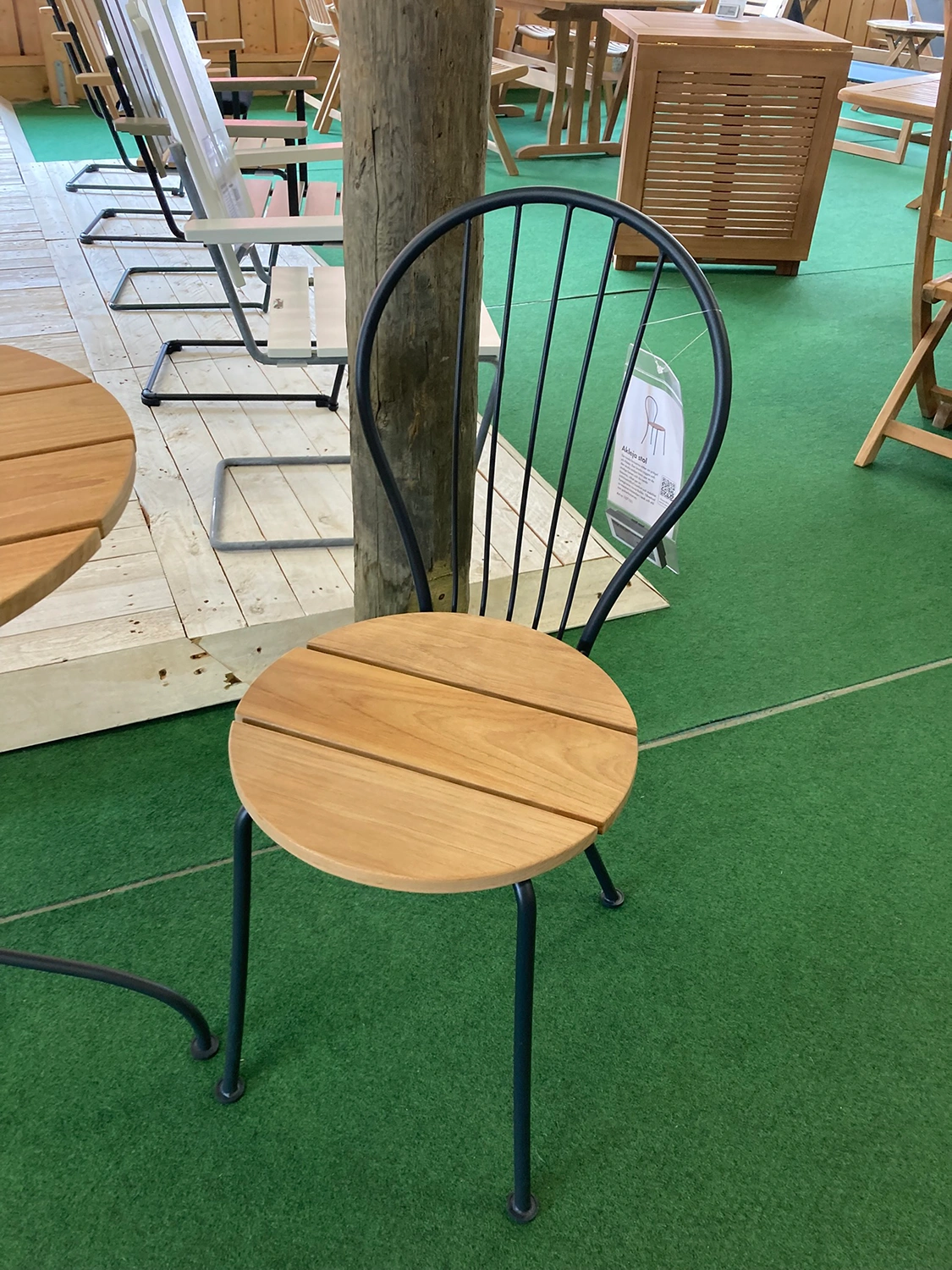 De runda formen sätter sin prägel på cafégruppen Akleja. Trädetaljerna i obehandlad teak bärs upp av de stadiga benen och de runda tassarna. Akleja-serien har tagits fram i samarbete med formgivaren Jonas Bohlin.