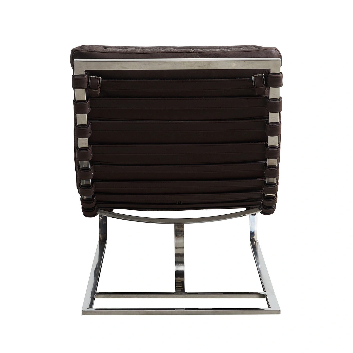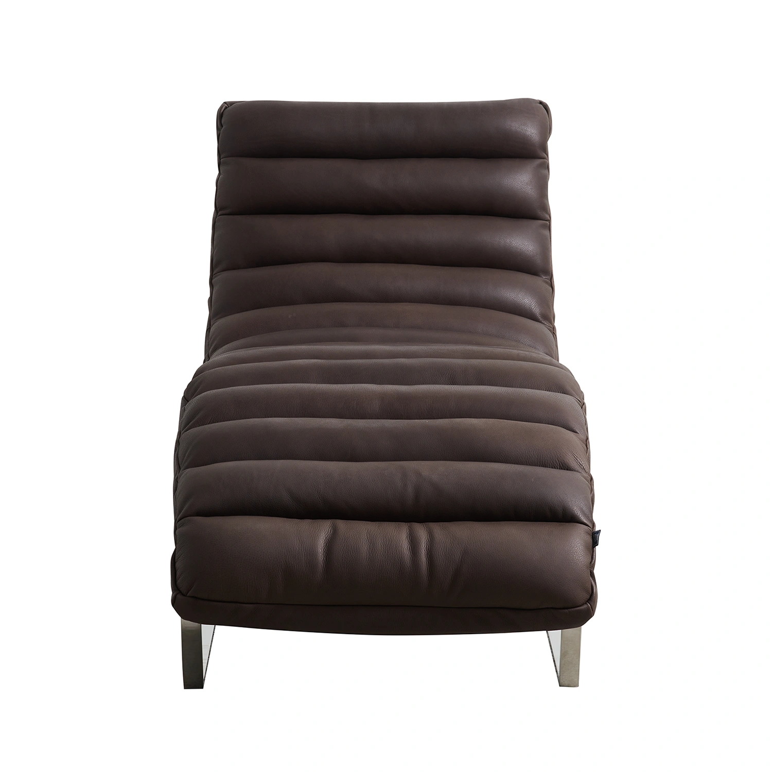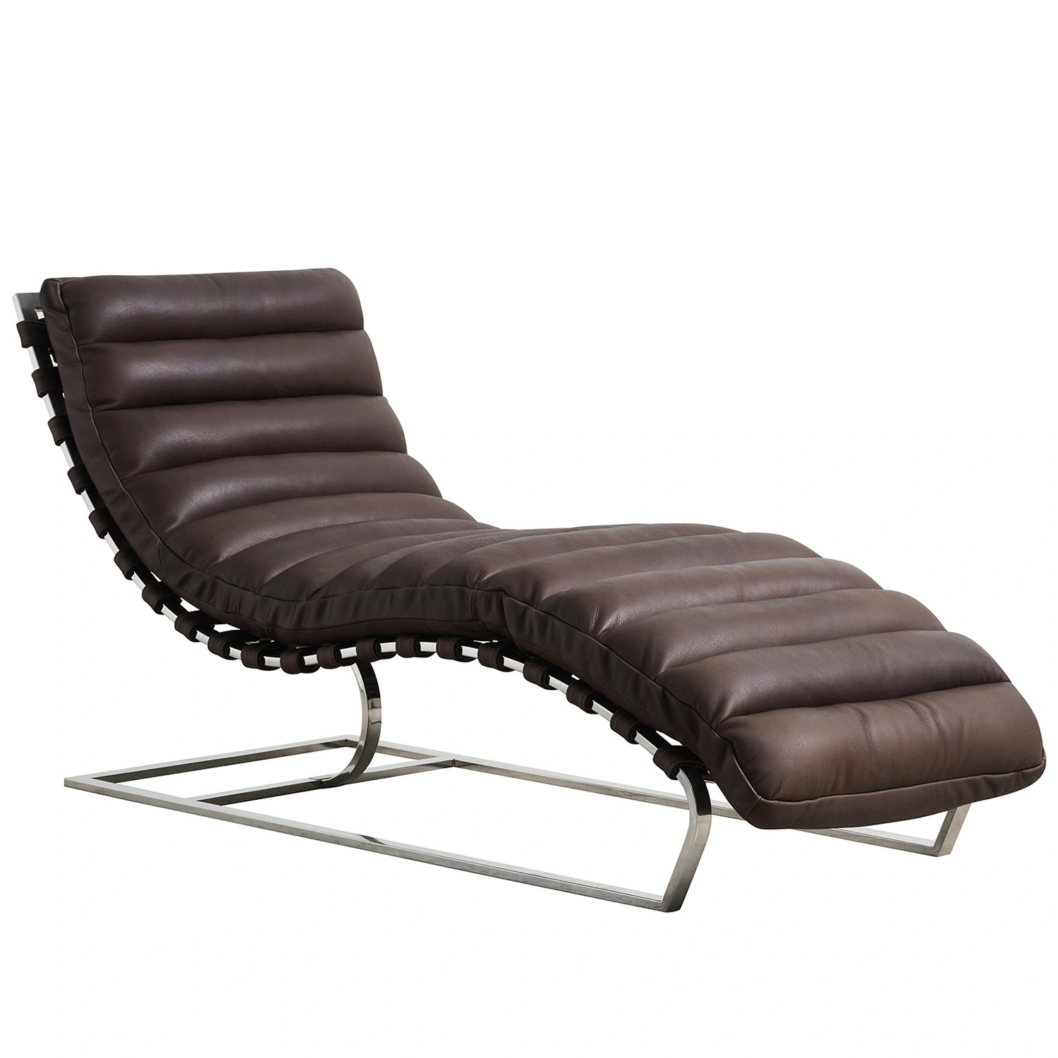 Elegant schäslong i mörkbrunt läder med ett formgjutet säte och distinkt horisontella sömmar som tillför djup och karaktär. Den generöst vadderade sitsen ger hög komfort och ett följsamt stöd för hela kroppen. Underredet i borstad metall skapar en stilren kontrast mot det mjuka lädret och ger en modern och arkitektonisk känsla.