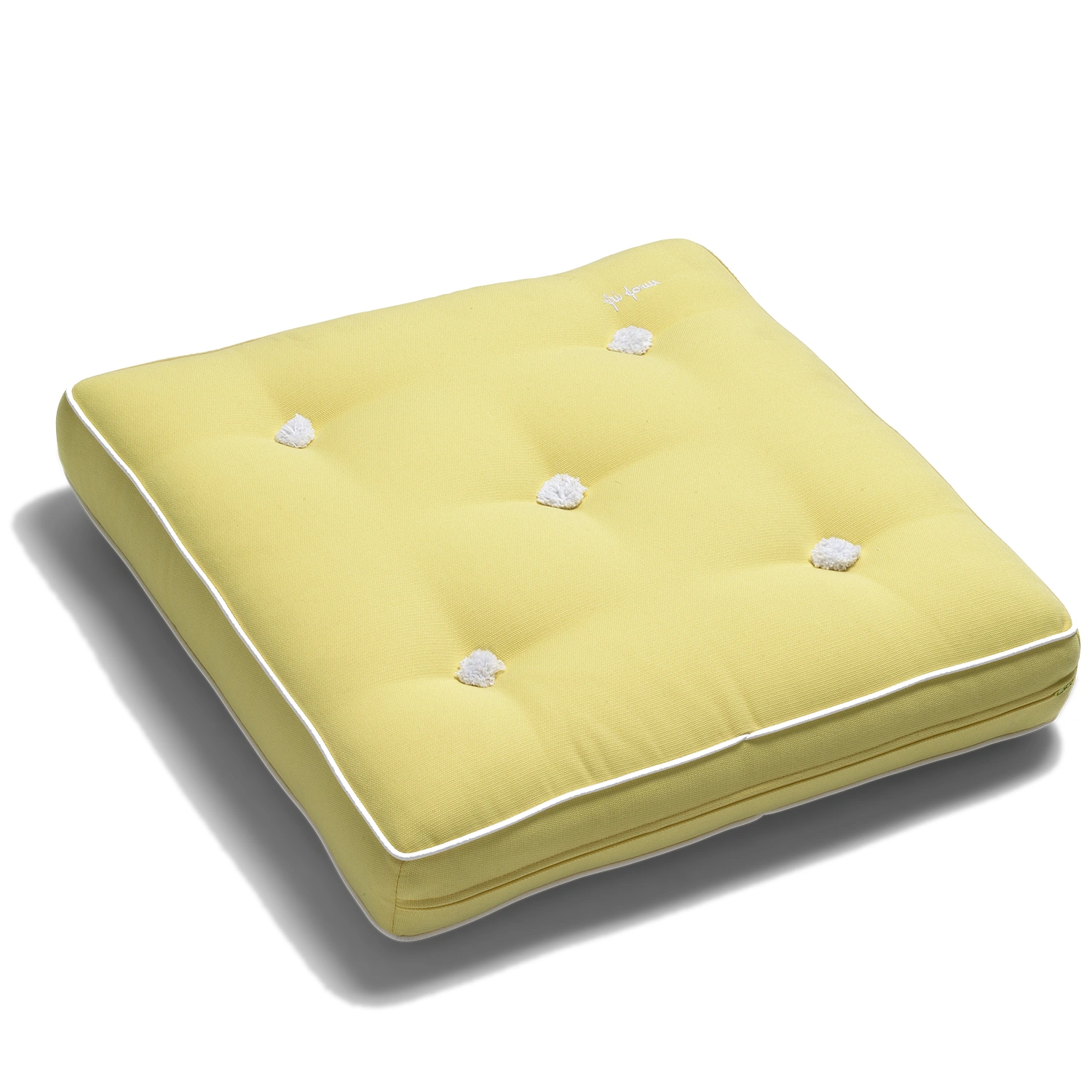 Fri Form Dyna 55 i ljusgult ger din uteplats en varm och somrig ton. Dynan är vändbar och tillverkad i scotchgardbehandlad dralon som är både slitstark och väderbeständig. Med vit paspoal, klädda knappar och den ikoniska Fri Form-brodyr blir den ett elegant inslag i din möbelgrupp. Passar Fri Forms fåtöljer, soffor, pallar och hammock.