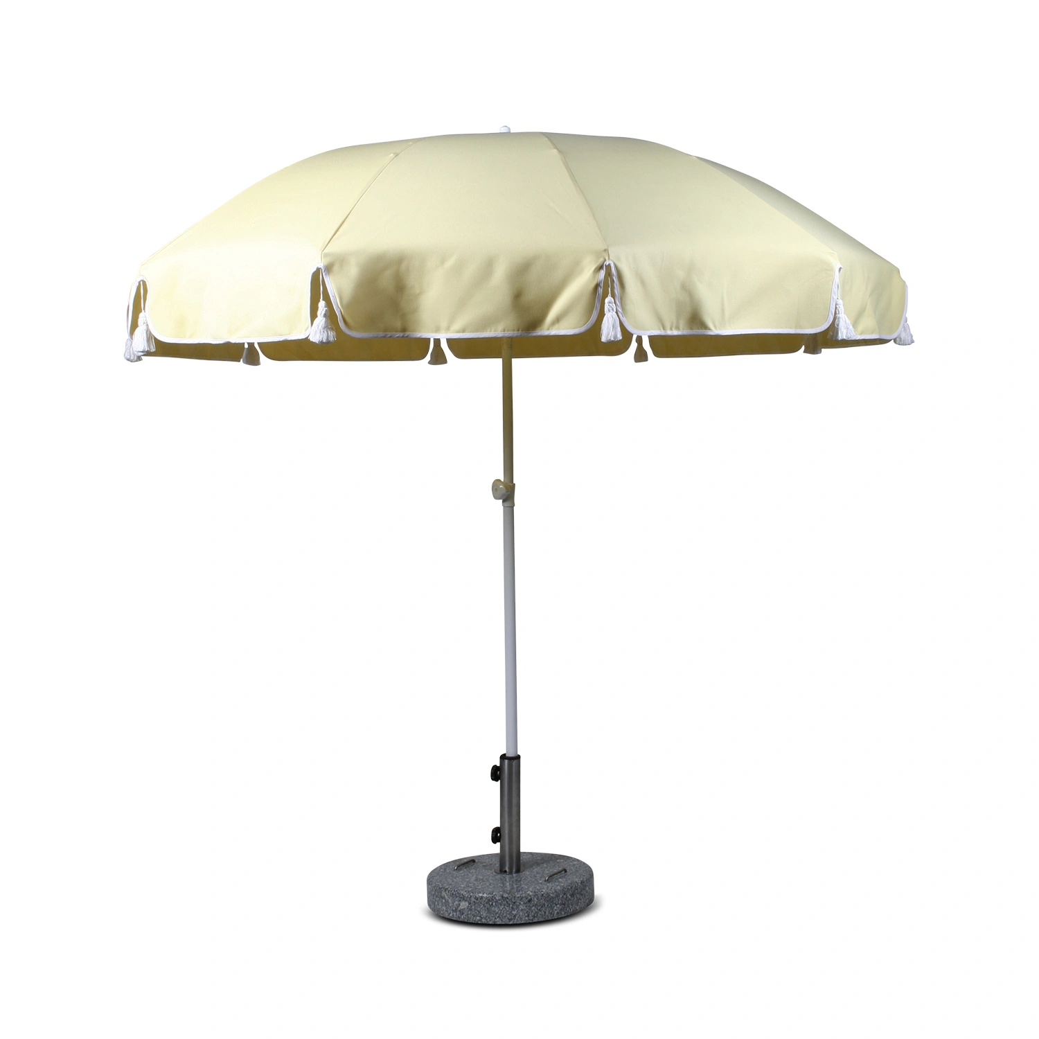 Fri Form Parasoll vit/ljusgul är ett elegant och funktionellt solskydd som kompletterar din uteplats med klassisk design. Parasollet har ett vitlackerat stålstativ och en slitstark duk i dralon – ett tyg som är väderbeständigt och enkelt att underhålla. De nedhängande tofsarna och kanterna med vit paspoal ger en tidlös och exklusiv känsla.