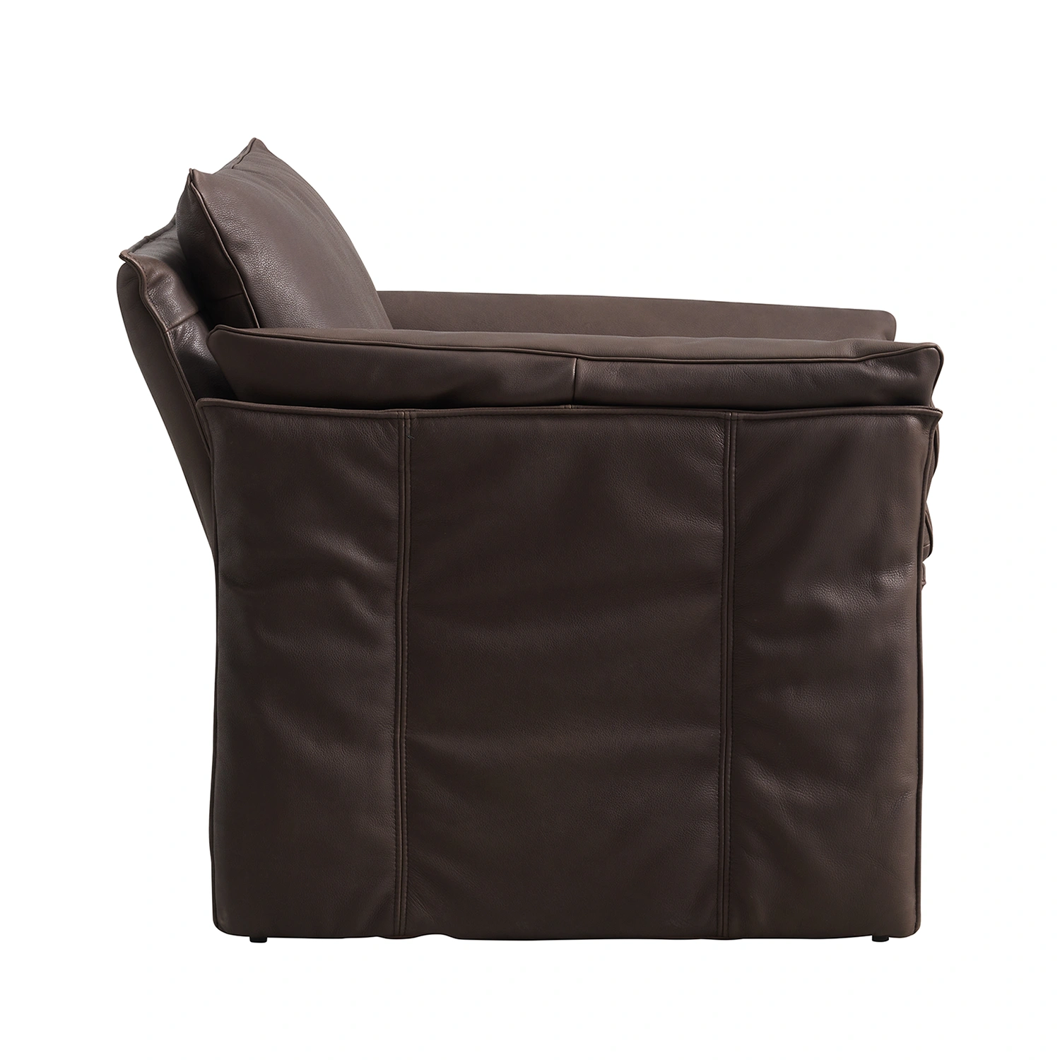 Den djupa sitsen i kombination med mjuka, lösa kuddar i fjädermix skapar en inbjudande och avslappnad känsla – perfekt för långa stunder av vila och återhämtning. Det naturliga fullnarvslädret ger fåtöljen en lyxig karaktär med vacker patina som bara blir bättre med tiden.