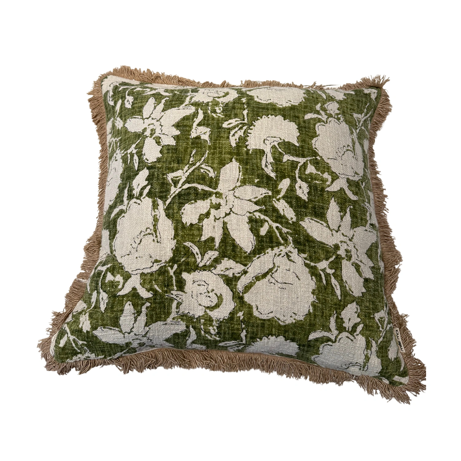 Ge soffan eller sängen en varm och inbjudande känsla med kuddfodralet Simplicity Flower i mörkgrönt. Kuddfodralet är i bomull i en offwhite färg tryckt med ett grönt blommönster. Fransarna runt om förstärker den bohemiska och tidlösa stilen.