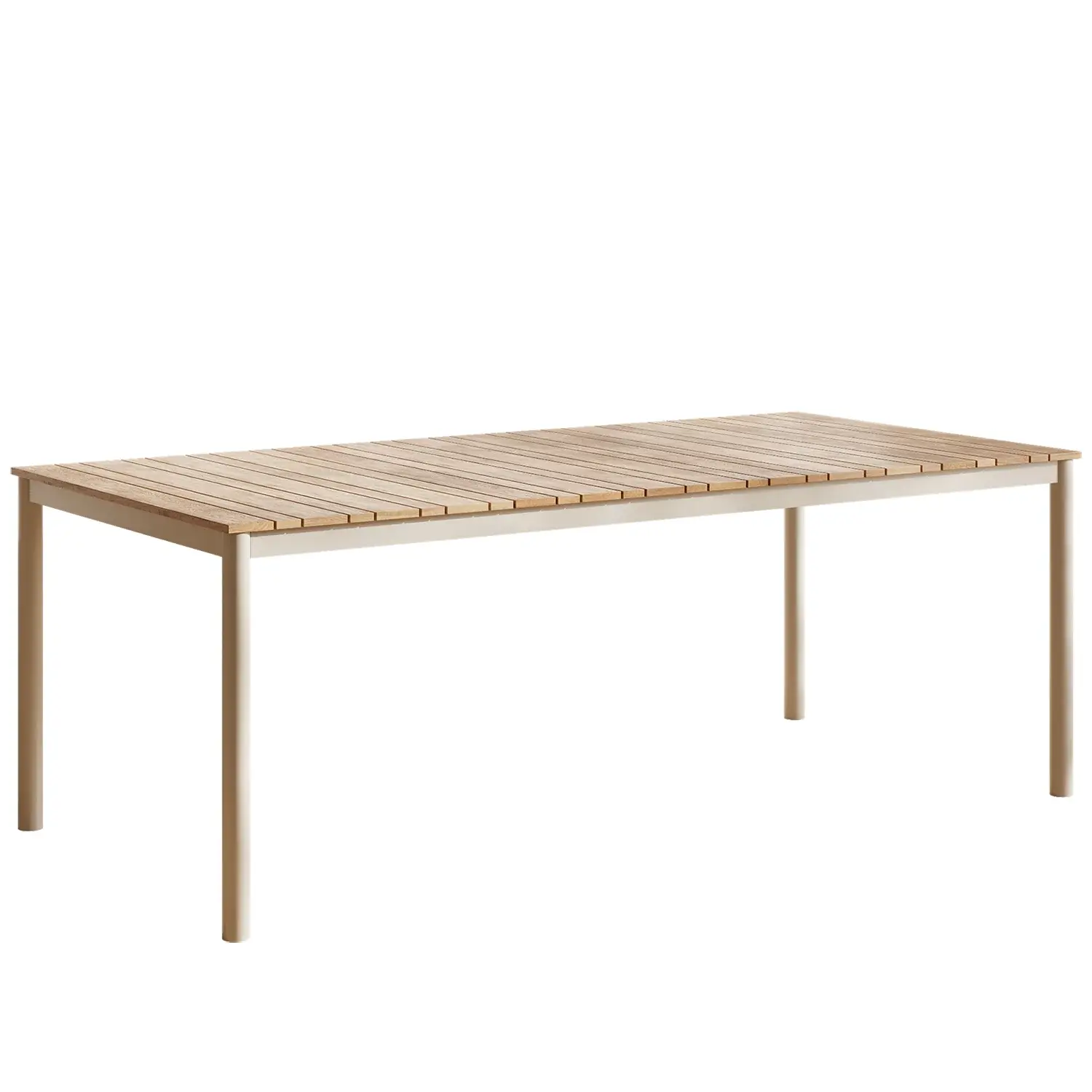 Mood Nova är ett modernt bord med en sandgrå stomme och en unik bordsskiva bestående av teakribbor i två olika bredder. Denna eleganta design skapar ett dynamiskt uttryck, perfekt för utomhusmiljöer. Den neutrala färgen på ramen i kombination med den strukturerade bordsskivan ger bordet en tidlös och stilren look.