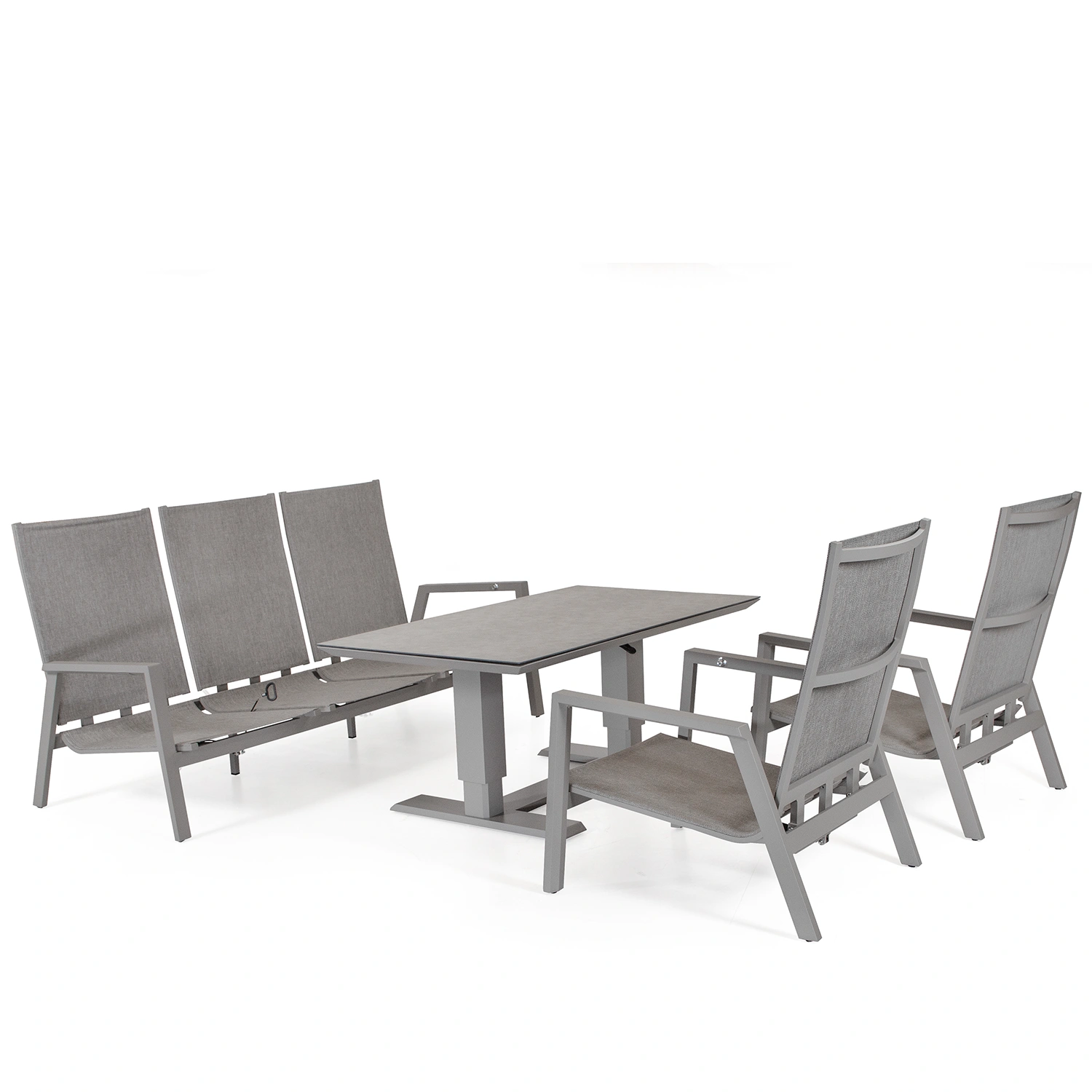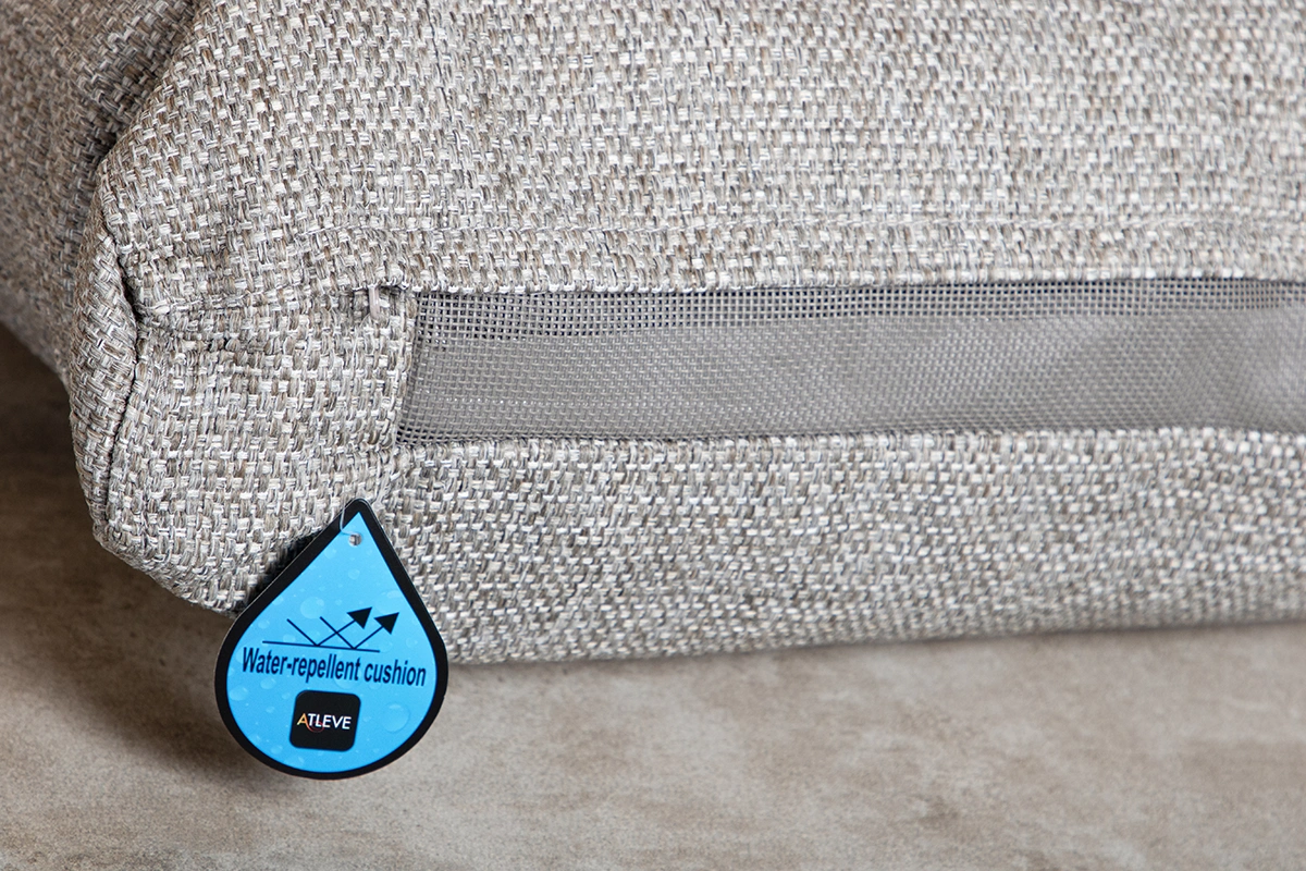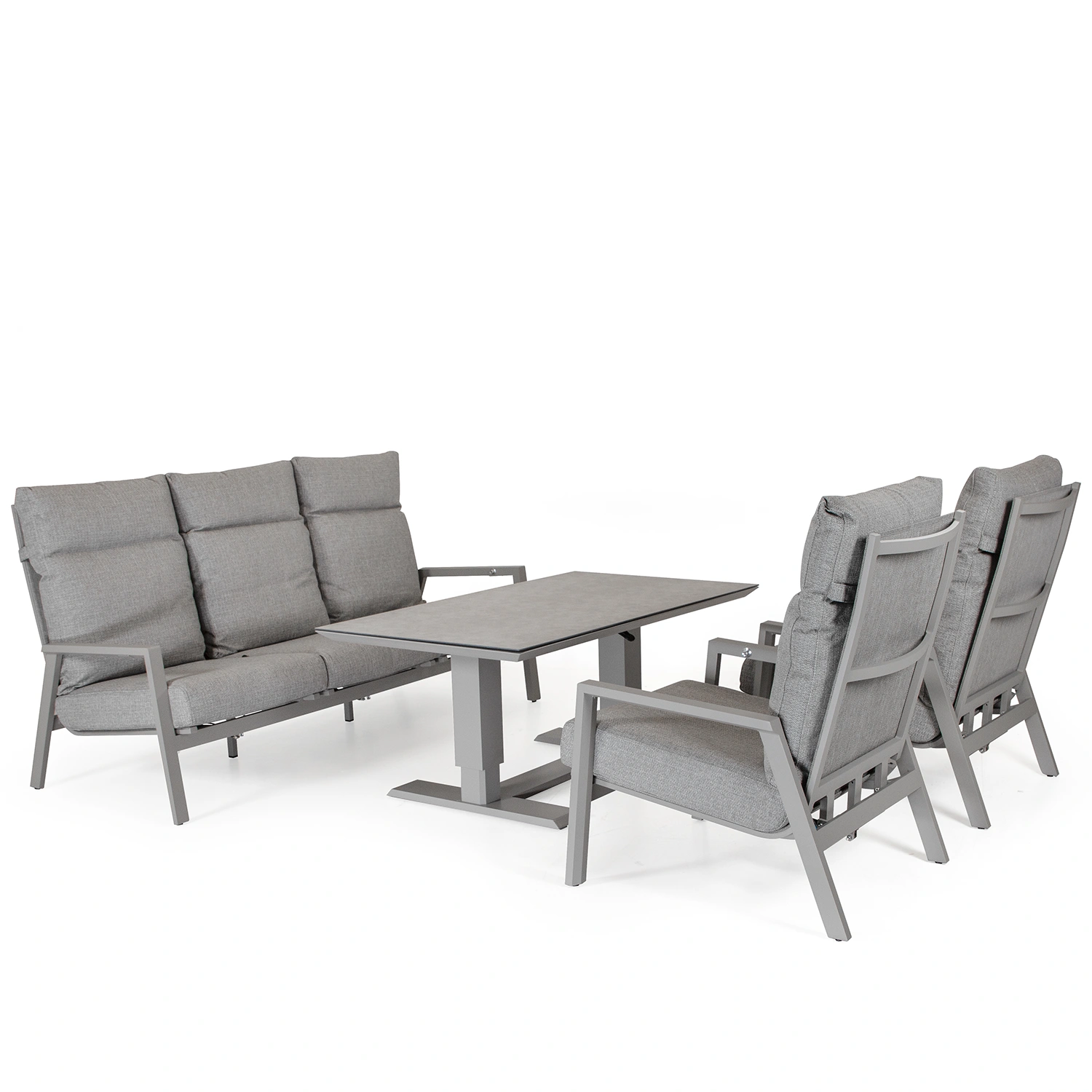 Palau är en aluminiumserie från Atleve med både matgrupper, soffgrupper och tillbehör. Soffgruppen består av 1 3-sitssoffa, 2 ställbara fåtöljer och 1 höj och sänkbart soffbord. Soffan, fåtöljerna och bordet har stomme i färgen Khaki. Dynorna är grå/beige allvädersdynor.