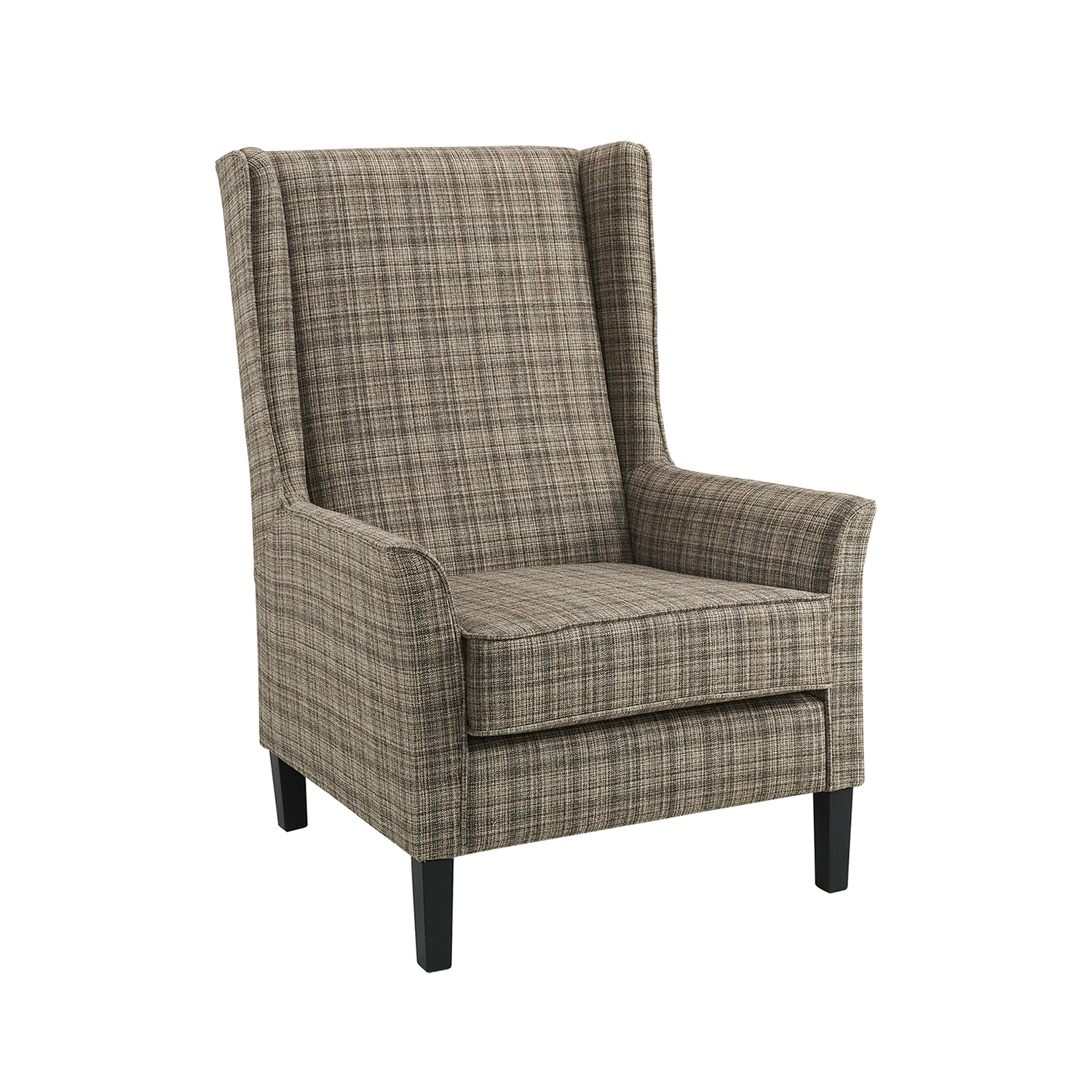 Fåtöljen är klädd i ett mjukt, vävt tyg som känns lyxigt, slitstarkt och behagligt att sitta i. De raka träbenen ger en stabil bas och skapar en vacker kontrast mot den textila klädseln. En dold kantsöm längs fåtöljens linjer förstärker den skräddade känslan och lyfter helhetsintrycket.