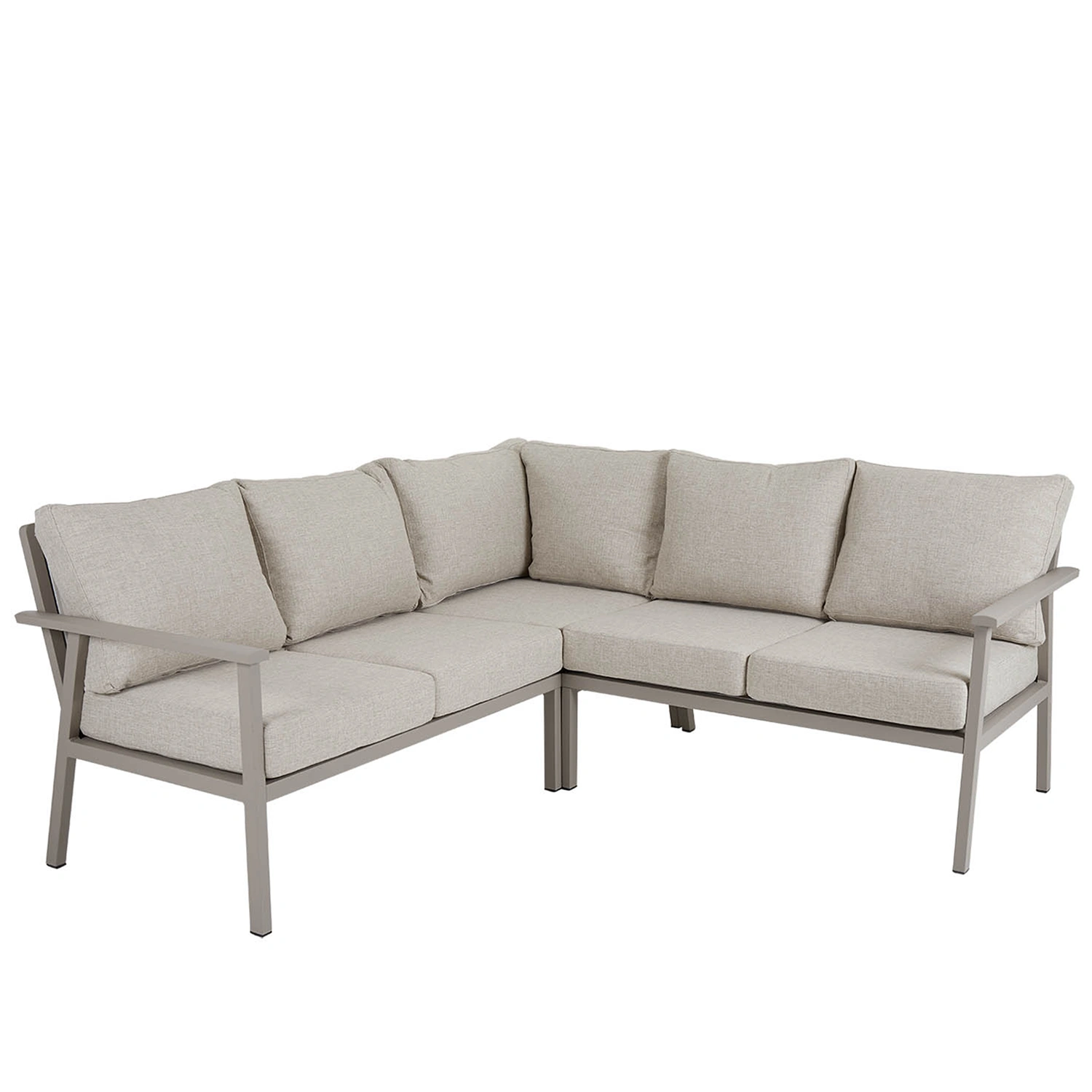 Samvaro hörnsoffa Hög är lite högre än de flesta loungesoffor i aluminium. I kombination med det lite högre soffbordet ger detta en grupp som man även kan sitta och äta vid.
