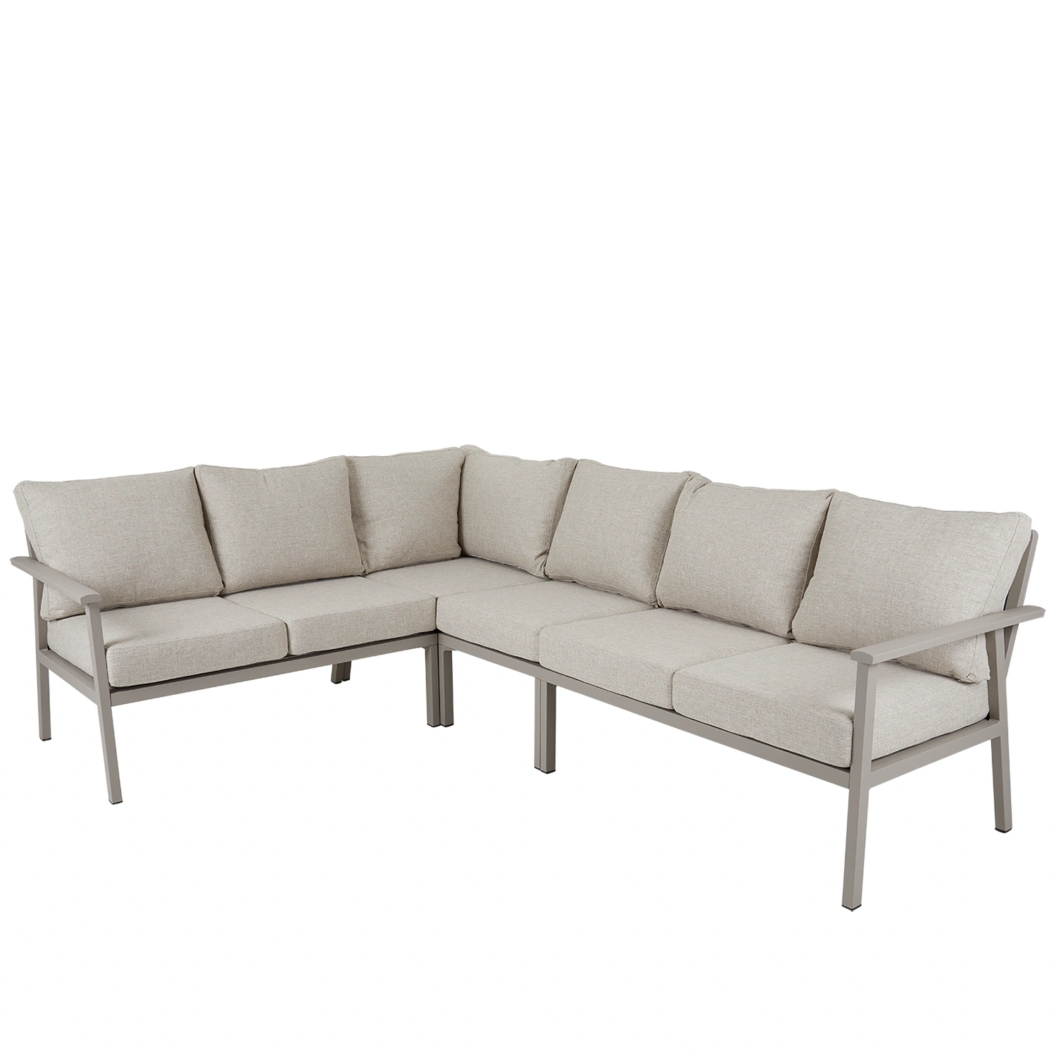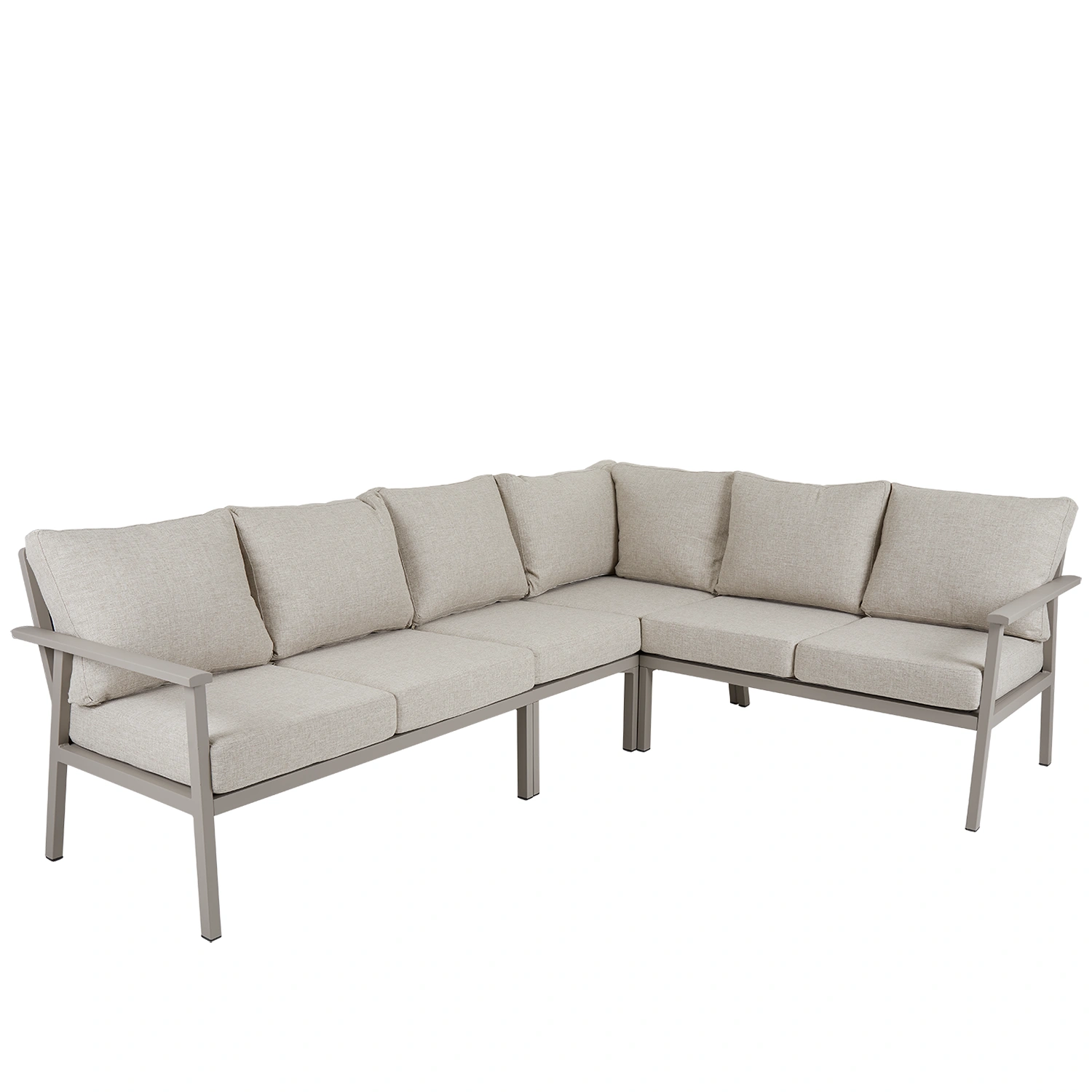Samvaro hörnsoffa Hög är lite högre än de flesta loungesoffor i aluminium. I kombination med det lite högre soffbordet ger detta en grupp som man även kan sitta och äta vid.
