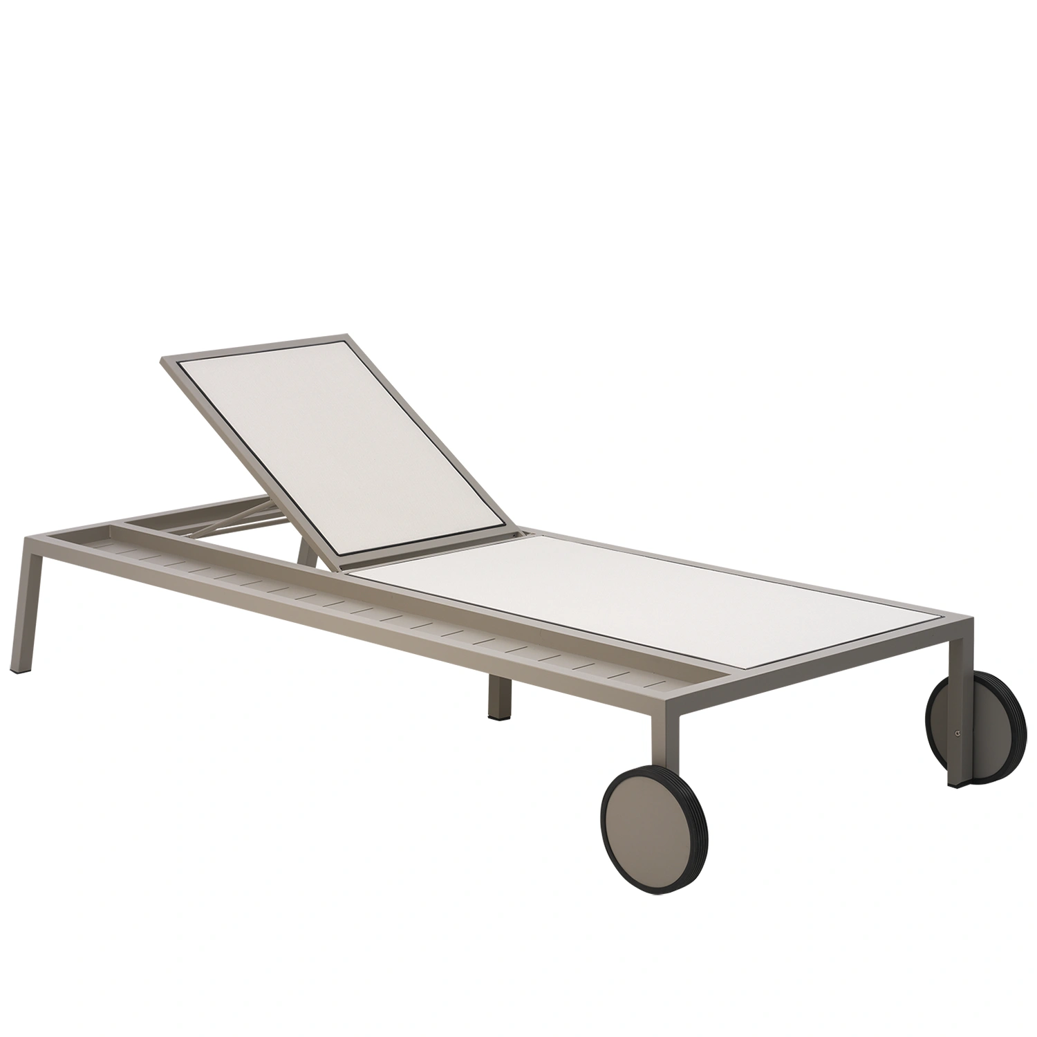 Denna extra breda solsäng erbjuder generös komfort med en inbyggd sidohylla på höger sida för dryck, böcker eller solkräm. Tack vare hjulen är den enkel att flytta, och med mjuka tyger och en design skapad för avkoppling tillför den ännu mer bekvämlighet och elegans till din utemiljö. Dynan har TPU-liner.