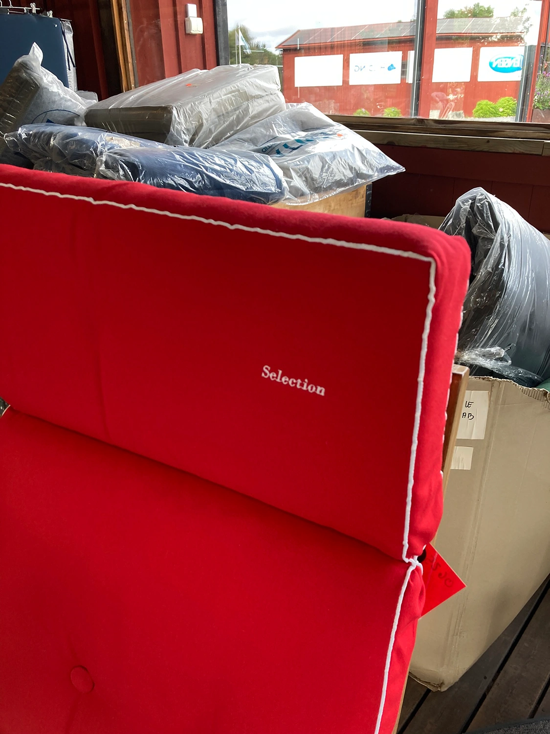Dynan har två knappar i ryggen med ”Selection” broderat på nackdelen. Tyget är ett rött Dralontyg med vit kederlist runt om. Dralondynor är mycket tåliga mot solblekning och behåller därför sin färg utan att blekas under lång tid.