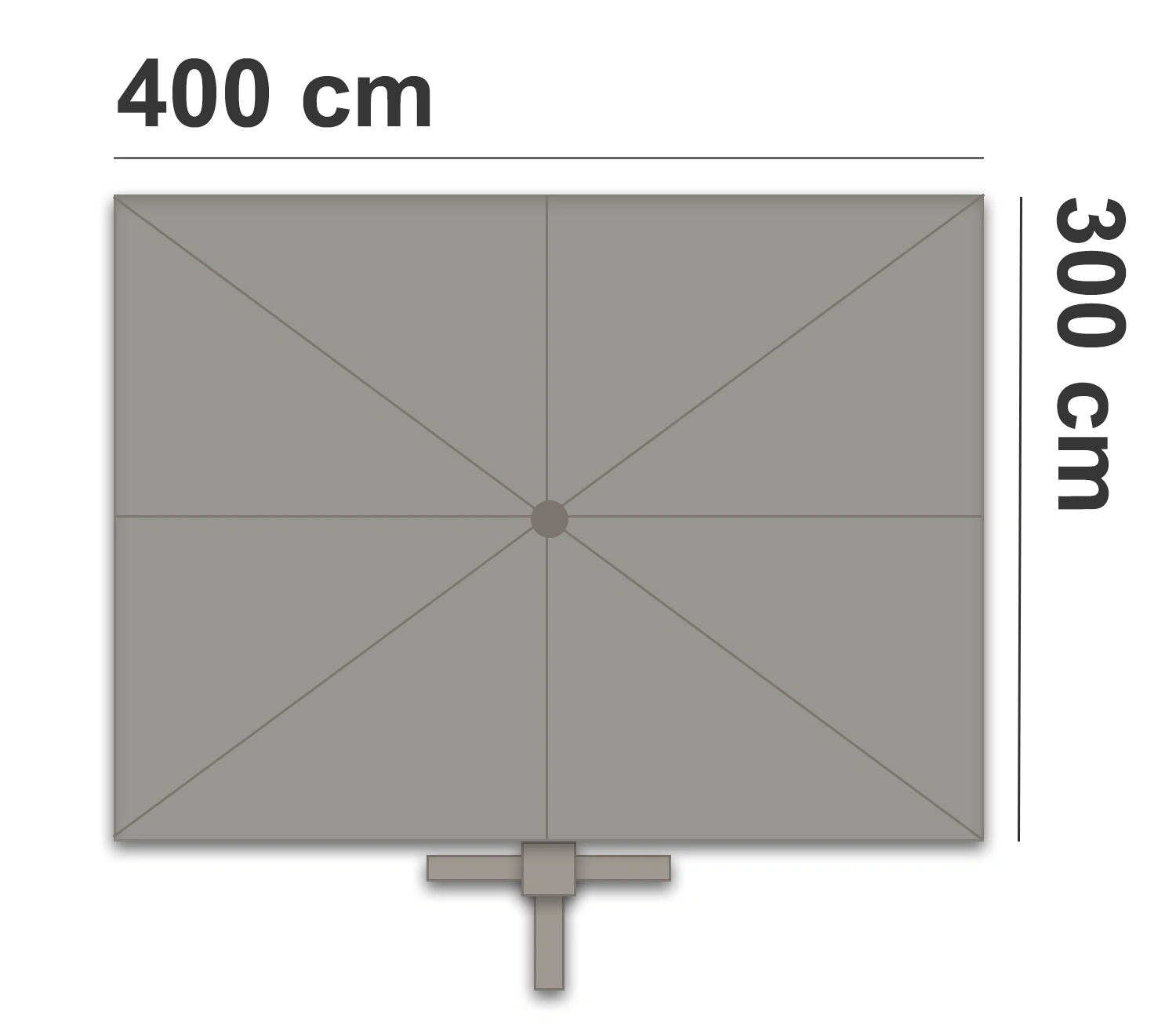 Detta parasoll har en rektangulär parasollduk. Kapellets bredd (från stången sett) är 400 cm och djupet är 300 cm. Med andra ord är stången placerad på dukens långsida.